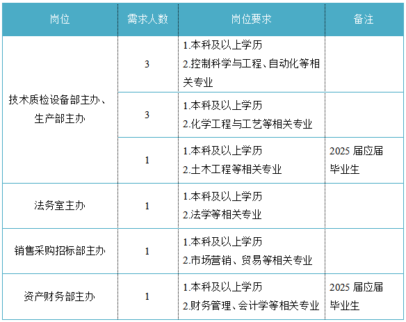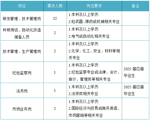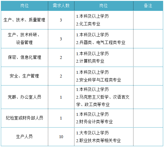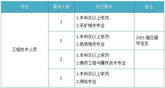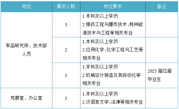 福建省機電(控股)有限責任公司(福建省國防科技工業公司)是由原省國防科工辦所屬企業為主,原省機械廳所屬企業劃入組建的省國資委出資的國有企業,現有全資、控股和參股企業48家。 在閩唯一一家地方軍工企業;民爆物品生產與銷售資質、軍品科研與生產資質、硝酸銨生產與銷售資質、營業性爆破作業單位一級資質、礦山工程施工總承包一級資質、環保工程專業承包三級資質;國家甲級設計院,擁有工業與民用建築工程設計、谘詢、工程監理等綜合資質;華東地區最大的硝酸銨生產企業... 省級重點實驗室 1個 省級工程技術研究中心 2個 省級企業技術中心 3個 省級技能大師工作室 2個 五險二金 帶薪年假 工會福利 健康體檢 午餐補貼 通訊補貼 文體活動...... (一)基本條件 1.具有中華人民共和國國籍,擁護中國共產黨的領導,熱愛社會主義; 2.遵紀守法,無違法違紀違規等不良記錄; 3.具有良好的身體素質和心理素質; 4.具備符合崗位要求的文化程度和工作能力。 (二)資格條件 應屆高校畢業生(含:①2025年度應屆高校畢業生,以畢業證書落款年度為準,已簽訂就業協議、勞動合同、繳交社保等均不影響應屆生身份界定;②2024年度畢業、具有工作經曆及社保繳交記錄的高校畢業生;③畢業離校兩年內未就業的高校畢業生,畢業證書落款時間應為2023年1月1日以後),具備符合崗位要求的文化程度和工作能力。 聯係人:吳先生 聯係電話: 工作地點:福建永安 1.福建海峽科化股份有限公司永安分公司(1人) 聯係人:田經理 聯係電話: 工作地點:福建永安 2.福建海峽科化股份有限公司福安分公司(1人) 聯係人:林經理 聯係電話: 工作地點:福建福安 3.福建海峽科化股份有限公司烽林分公司(7人) 聯係人:吳經理 聯係電話: 工作地點:三明明溪 4.福建海峽科化股份有限公司永春分公司(3人) 聯係人:賀經理 聯係電話: 工作地點:福建永春 5.福建海峽科化富興建設工程有限公司(7人) 聯係人:楊女士 聯係電話: 工作地點:福建三明 6.福建民化建設工程有限公司(2人) 聯係人:鄒女士 聯係電話: 工作地點:福建省內 7.青海青樂化工機械有限責任公司(22人) 聯係人:李先生 聯係電話: 工作地點:青海省海東市樂都區 8.青海海西東諾化工有限公司(4人) 聯係人:郭先生 聯係電話: 工作地點:青海省德令哈市 聯係人:李先生 聯係電話: 工作地點:山東沂源 聯係人:米先生 聯係電話: 工作地點:福建邵武 福建省機電沿海建築設計研究院有限公司(4人) 聯係人:李女士 聯係電話: 工作地點:福建福州 福建智和置業有限公司(2人) 聯係人:吳先生 聯係電話: 工作地點:福建福州 符合崗位招聘條件的應聘者可請將簡曆投遞至指定郵箱:;並將郵件標題和簡曆名稱命名為“崗位+姓名+畢業院校+專業”。 即日起開始接受報名,截止時間為2024年12月31日。 招聘工作按照簡曆投遞-資格審查篩選-筆試-麵試-發放OFFER-體檢-公示-簽約錄用等程序進行。 資格審查貫穿招聘全過程,在招聘各環節若有發現報考信息不實、條件不符等情形的,一律取消應聘資格,不得進入下一環節;已經錄用的,我司有權解除勞動關係,由此發生的個人損失由應聘人員自行承擔。 按an照zhao招zhao聘pin條tiao件jian對dui應ying聘pin人ren員yuan進jin行xing資zi格ge審shen查zha,擇ze優you確que定ding參can加jia筆bi試shi和he麵mian試shi人ren員yuan。審shen核he通tong過guo者zhe將jiang通tong過guo電dian話hua或huo郵you件jian方fang式shi通tong知zhi,審shen核he未wei通tong過guo者zhe不bu再zai另ling行xing通tong知zhi。 公開招聘工作堅持“公開、平等、競爭、擇優”的原則,嚴肅紀律,秉公辦事,嚴禁弄虛作假,徇私舞弊,全程接受紀檢監察部門和社會的監督。報考者有弄虛作假、違紀違規行為的,一經發現,均取消其應聘資格,並將有關情況通報其所在學校或單位。構成犯罪的,依法追究刑事責任。