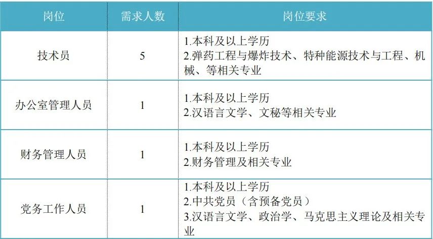福建省機電(控股)有限責任公司(福建省國防科技工業公司)是由原省國防科工辦所屬企業為主,原省機械廳所屬企業劃入組建的省國資委出資的國有企業,現有全資、控股和參股企業22家。 在閩唯一一家地方軍工企業; 民爆物品生產與銷售資質、軍品科研與生產資質、硝酸銨生產與銷售資質、營業性爆破作業單位一級資質、礦山工程施工總承包一級資質、環保工程專業承包三級資質; 國家甲級設計院,擁有工業與民用建築工程設計、谘詢、工程監理等綜合資質; 華東地區最大的硝酸銨生產企業... 省級重點實驗室 1個 省級工程技術研究中心 2個 省級企業技術中心 3個 省級技能大師工作室 2個 五險二金 帶薪年假 工會福利 健康體檢 午餐補貼 通訊補貼 文體活動...... 1.具有中華人民共和國國籍,擁護中國共產黨的領導,熱愛社會主義; 2.遵紀守法,無違法違紀違規等不良記錄; 3.具有良好的身體素質和心理素質; 4.應屆高校畢業生(含:①2024年度應屆高校畢業生,以畢業證書落款年度為準,已簽訂就業協議、勞動合同、繳交社保等均不影響應屆生身份界定;②2023年度畢業、具有工作經曆及社保繳交記錄的高校畢業生;③畢業離校兩年內未就業的高校畢業生,畢業證書落款時間應為2022年1月1日以後),具備符合崗位要求的文化程度和工作能力。 聯係人:蔣女士 聯係電話: 簡曆投遞郵箱: 工作地點:福建福州 1.福建兵工裝備有限公司本部 聯係人:吳先生 聯係電話: 簡曆投遞郵箱: 工作地點:福建永安 2.福建富興彩彈槍有限公司 聯係人:王女士 聯係電話: 簡曆投遞郵箱: 工作地點:福建漳州 3.福建永安三燕機械有限公司 聯係人:龐先生 聯係電話: 簡曆投遞郵箱: 工作地點:福建永安 1.福建海峽科化股份有限公司分公司 聯係人:葉先生 聯係電話: 簡曆投遞郵箱: 工作地點:福建龍岩、福建福安、福建明溪、福建永春 2.福建海峽科化富興建設工程有限公司 聯係人:楊女士 聯係電話: 簡曆投遞郵箱: 工作地點:福建三明 3.福建民化建設工程有限公司 聯係人:鄒女士 聯係電話: 簡曆投遞郵箱: 工作地點:福建省內 4.青海青樂化工機械有限責任公司 聯係人:李先生 聯係電話: 簡曆投遞郵箱: 工作地點:青海省海東市樂都區 5.青海海西東諾化工有限公司 聯係人:郭先生 聯係電話: 簡曆投遞郵箱: 工作地點:青海省德令哈市 聯係人:米先生 聯係電話: 簡曆投遞郵箱: 工作地點:福建邵武 聯係人:李女士 聯係電話: 簡曆投遞郵箱: 工作地點:福建福州 簡曆投遞 - 資格審查 - 筆試與麵試 - 發放Offer -體檢 - 簽約錄用 有意者請將簡曆投遞至相應公司的郵箱,並將簡曆命名為“崗位-姓名-學校專業”; 即日起開始接受報名,截止時間為2024年12月31日。 按an照zhao招zhao聘pin條tiao件jian對dui應ying聘pin人ren員yuan進jin行xing資zi格ge審shen查zha,擇ze優you確que定ding參can加jia筆bi試shi和he麵mian試shi人ren員yuan。審shen核he通tong過guo者zhe將jiang通tong過guo電dian話hua或huo郵you件jian方fang式shi通tong知zhi,審shen核he未wei通tong過guo者zhe不bu再zai另ling行xing通tong知zhi。